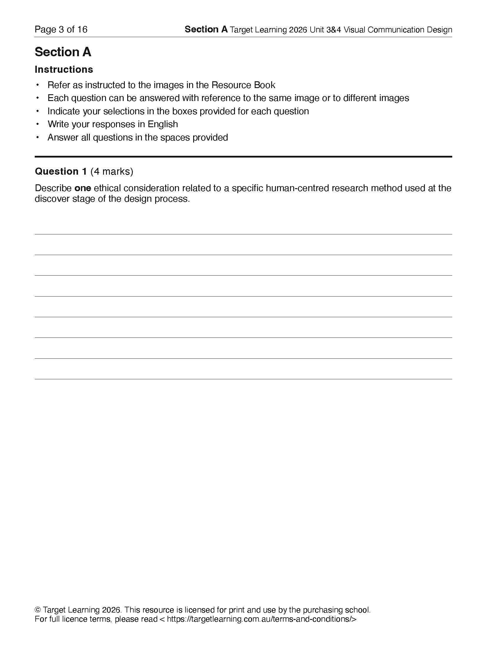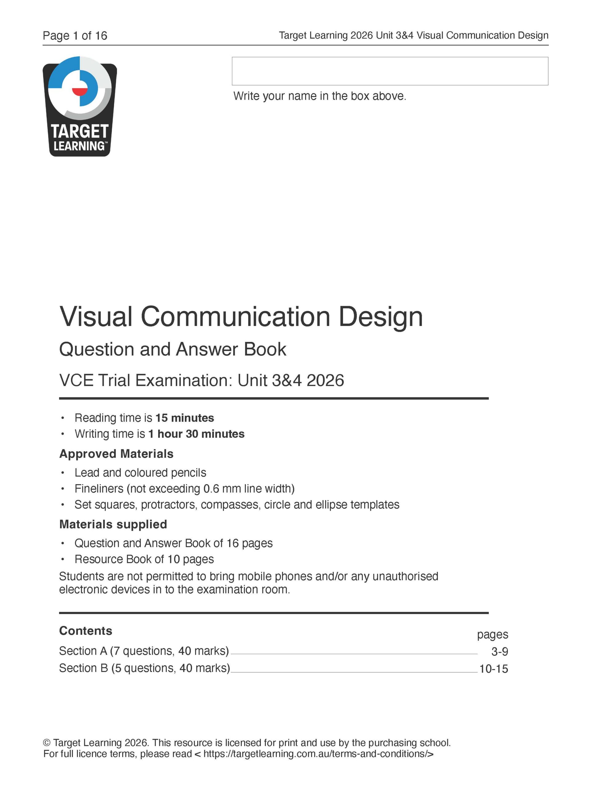Give students the most realistic Year 12 exam preparation available. The Target Learning 2026 Unit 3&4 Visual Communication Design Trial Examination is modelled on VCAA exams in format, style, marks and question type, and is precisely mapped to every Unit 3&4 Key Knowledge and Key Skills point, so nothing is left to chance.